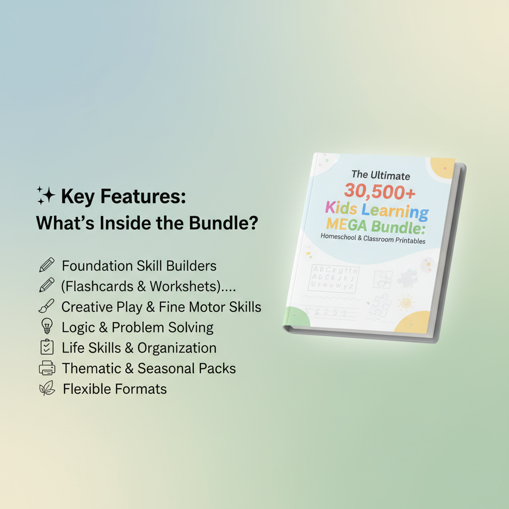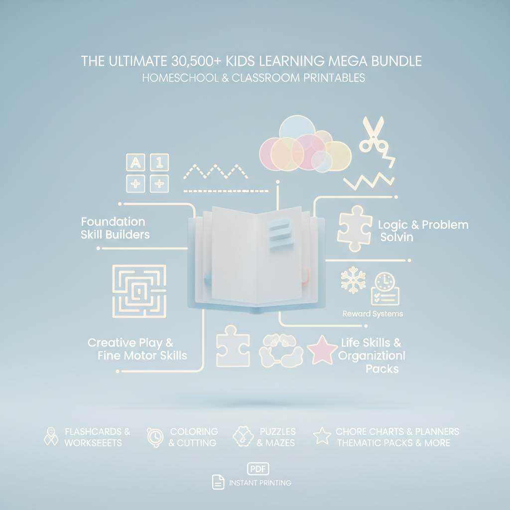 The Ultimate 30,500+ Kids Learning MEGA Bundle is your all-in-one resource for making education fun, effective, and accessible right from your printer. [cite_start]Filled with over 30,500 printable pages, this essential toolkit covers everything from foundational skills to fun activities, designed to boost creativity and critical thinking in preschoolers, kindergarteners, and early learners.